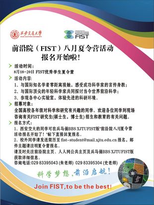 西安交大前沿科学研究院(FIST,bwin)将于2012年8月18-20日举办“2012年FIST优秀学生八月夏令营(FIST开放日——全国高校系列)”活动,夏令营将通过讲座介绍、导师见面、参观和交流等形式的互动交流,增强学生的科研兴趣,拓展学术视野,明确研究方向。夏令营期间还包括有意报考bwin2013年硕士、博士研究生的选拔工作。